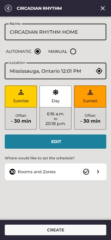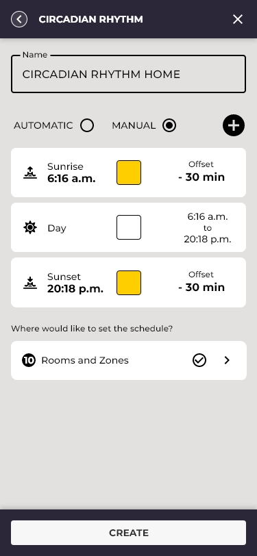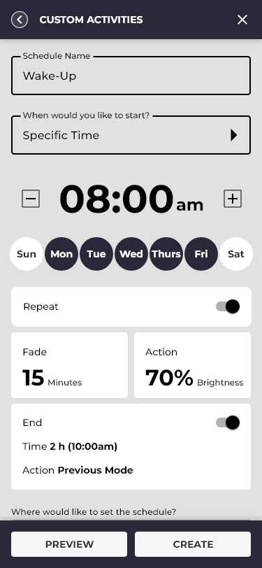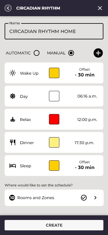 Activities differentiated the app most sharply from basic competitors. Rather than simple on/off timers, the system supported a full circadian rhythm engine, automatically adjusting color temperature and brightness based on time of day and actual sunrise/sunset data for the user's geographic location.