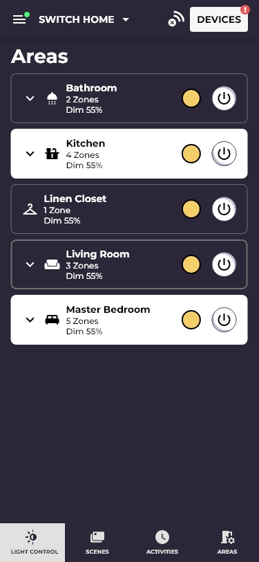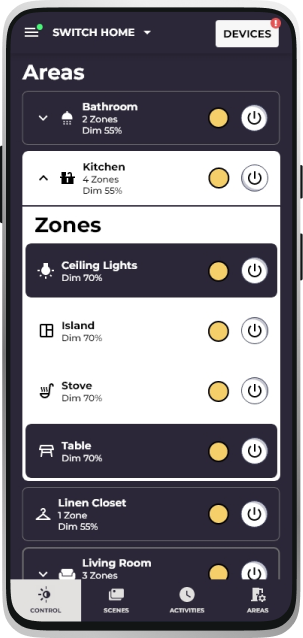 The most frequent action — turning a room off — must never require opening a detail screen. Both area-level and zone-level rows carry an on/off toggle and dim indicator. This doubled the control surface but reduced the task to a single tap for ~90% of daily interactions.