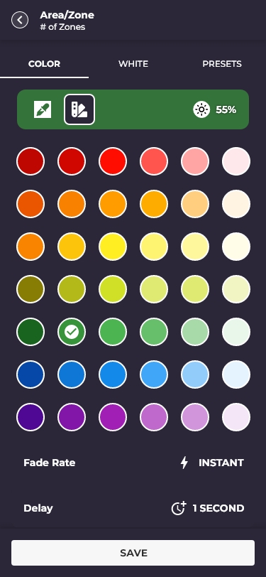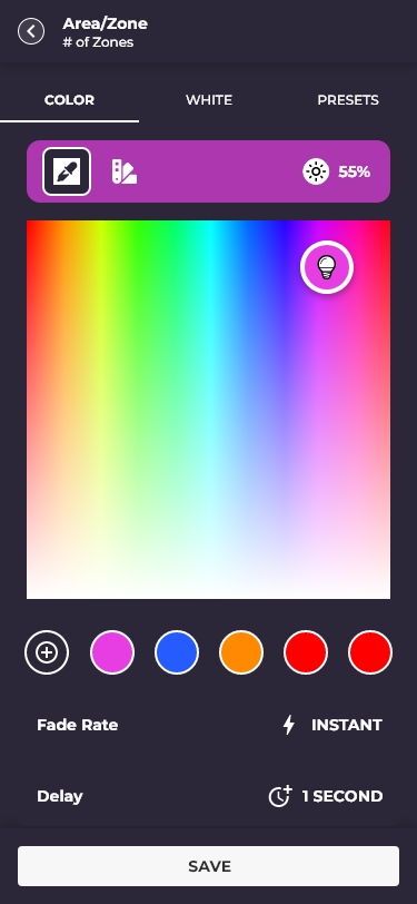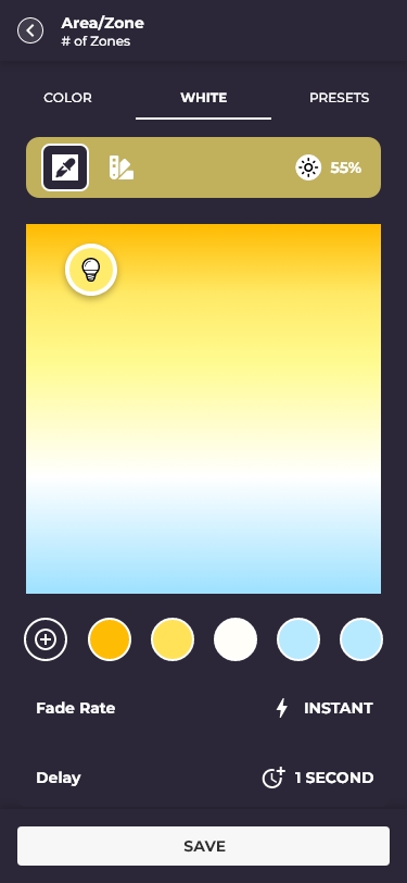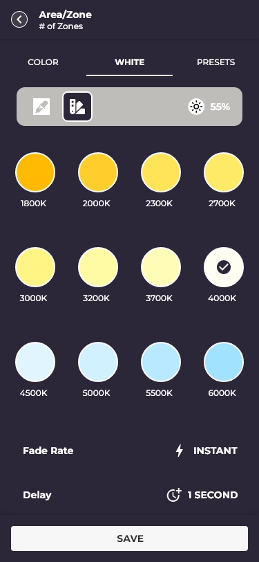 Accordion areas/zones, slider detail, and full color/white temperature picker (COLOR · WHITE · PRESETS)