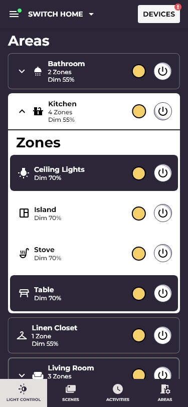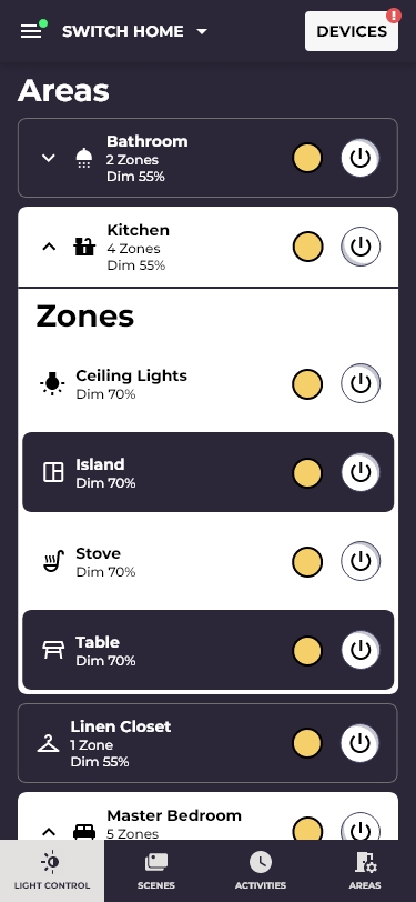 The most frequent action, turning a room off, must never require opening a detail screen. Both area-level and zone-level rows carry an on/off toggle and dim indicator. This doubled the control surface but reduced the task to a single tap for ~90% of daily interactions.