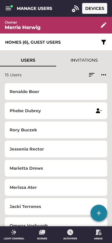 The persistent bottom navigation, Light Control, Scenes, Activities,